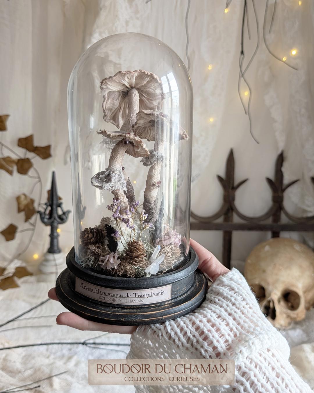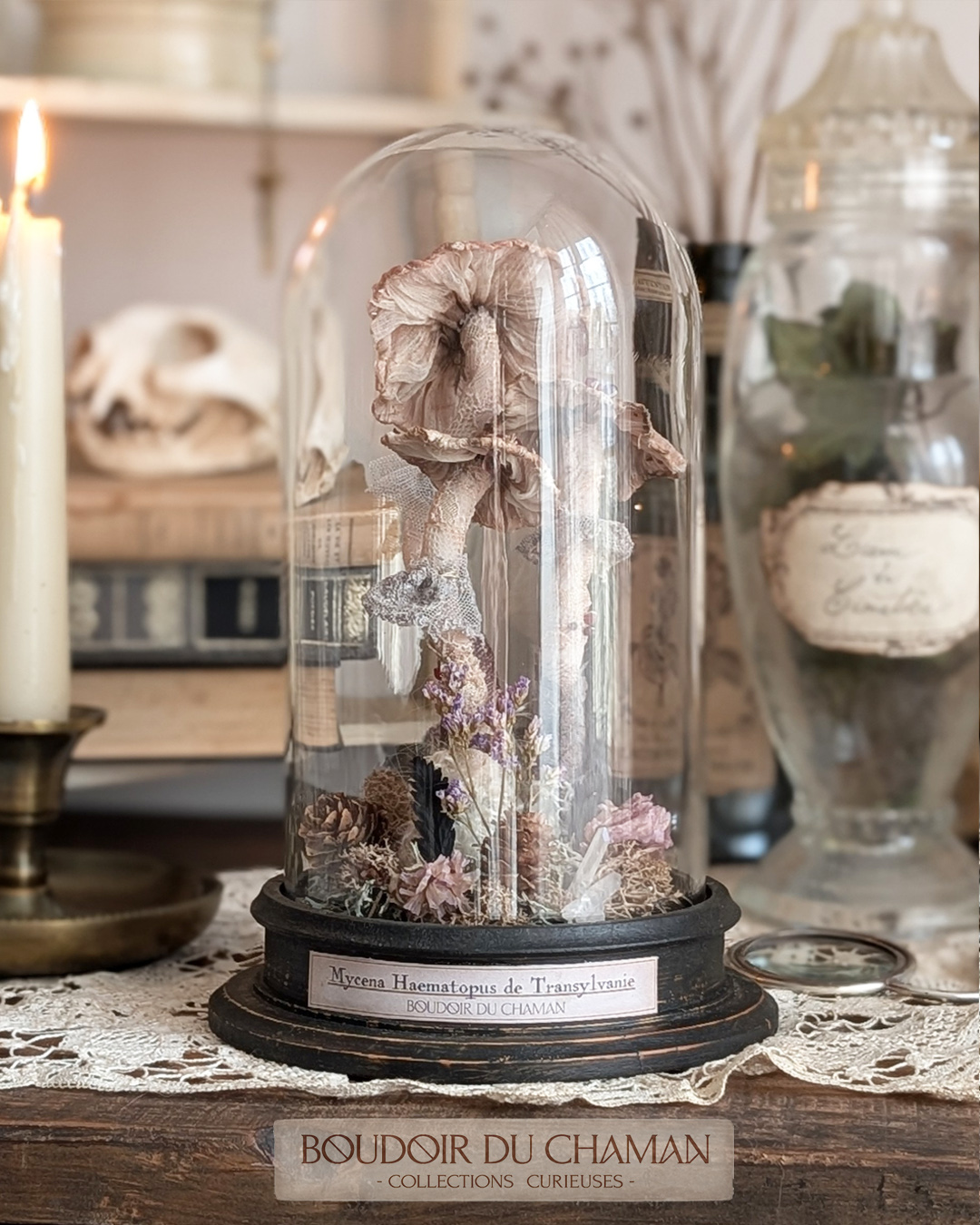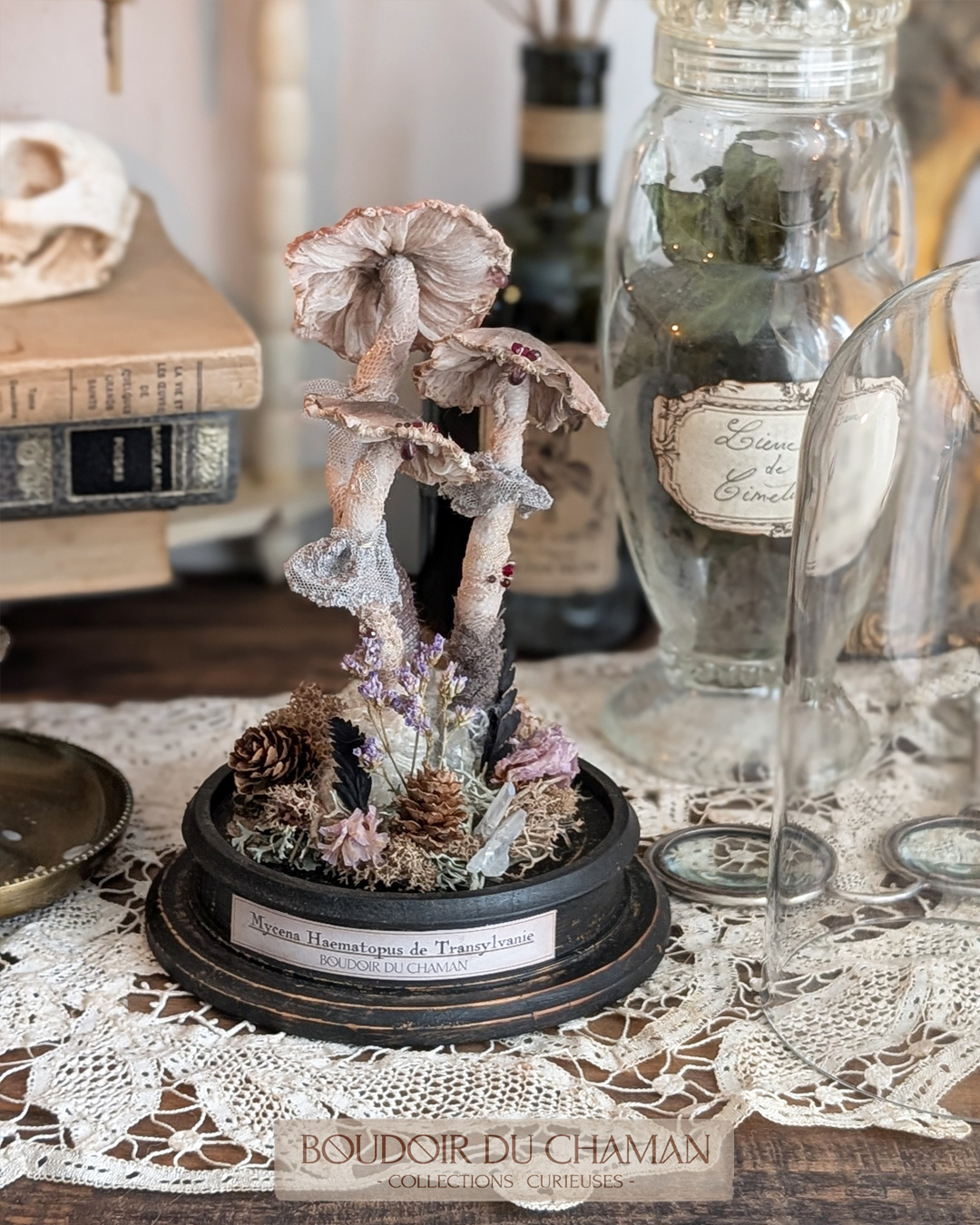 Mycène Hematopus sous Cloche . sculpture de champignon triple sur socle en bois tourné