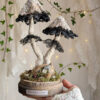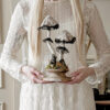 Les champignons de la collection Spores Enchantées sont entièrement cousus à la main à partir d’étoffes et de dentelles vintage. Brodés de perles de verre et orné de gemmes, ils s’inspirent des trésors de la nature et des forêts légendaires des livres de fantaisie. Chaque socle est tourné à la main par l’artisan français Auguste Léandre avec du bois issu de forêts éco-responsables.
