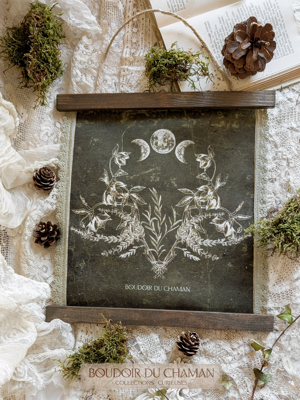 Pour une décoration mystique et des songes magiques. Cette tenture est imprimée d’un de mes dessins réalisé pour la fête celtique d’Imbolc. Elle met en scène des hellébores, de la bruyère et du romarin. Trois plantes magiques pour bénir, porter chance et purifier. Délicatement brodé de dentelle vert mousse. Les toiles sont imprimées en France avec des encres textiles écologiques sur du coton bio. pin* traité et ficelle en chanvre.