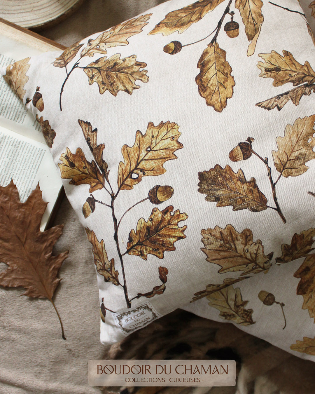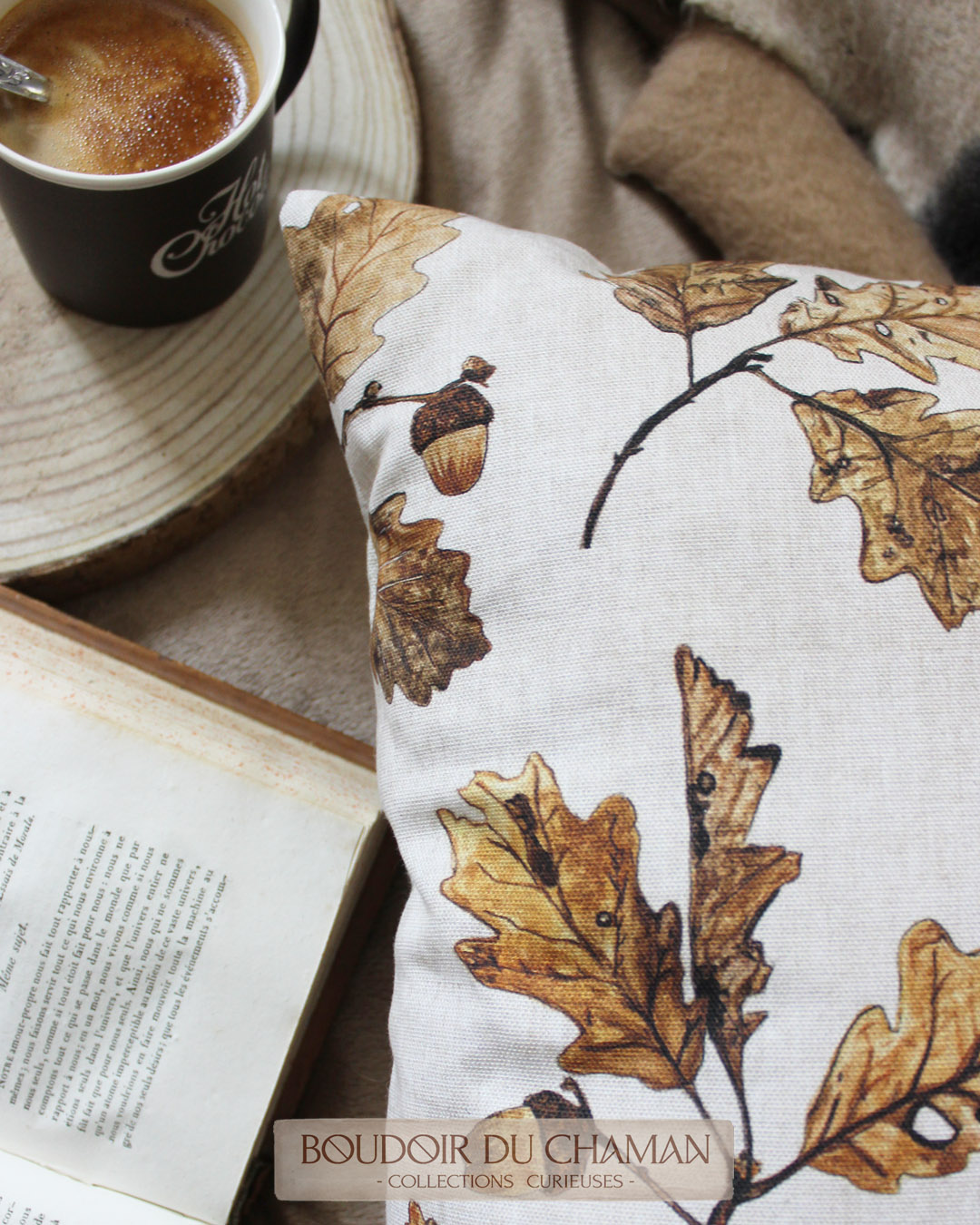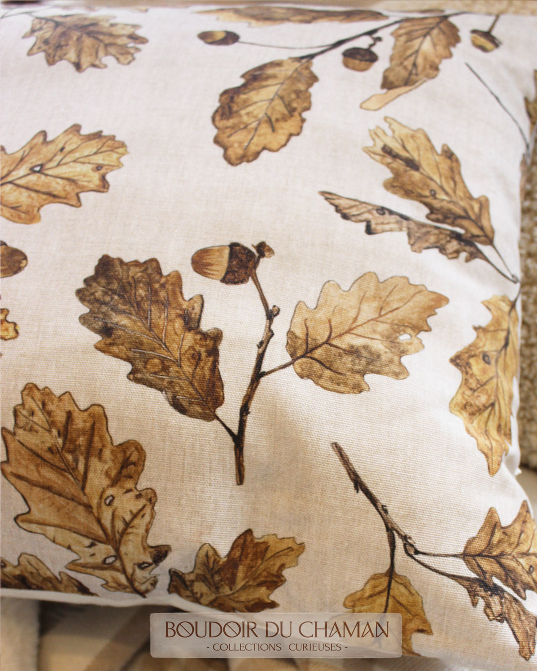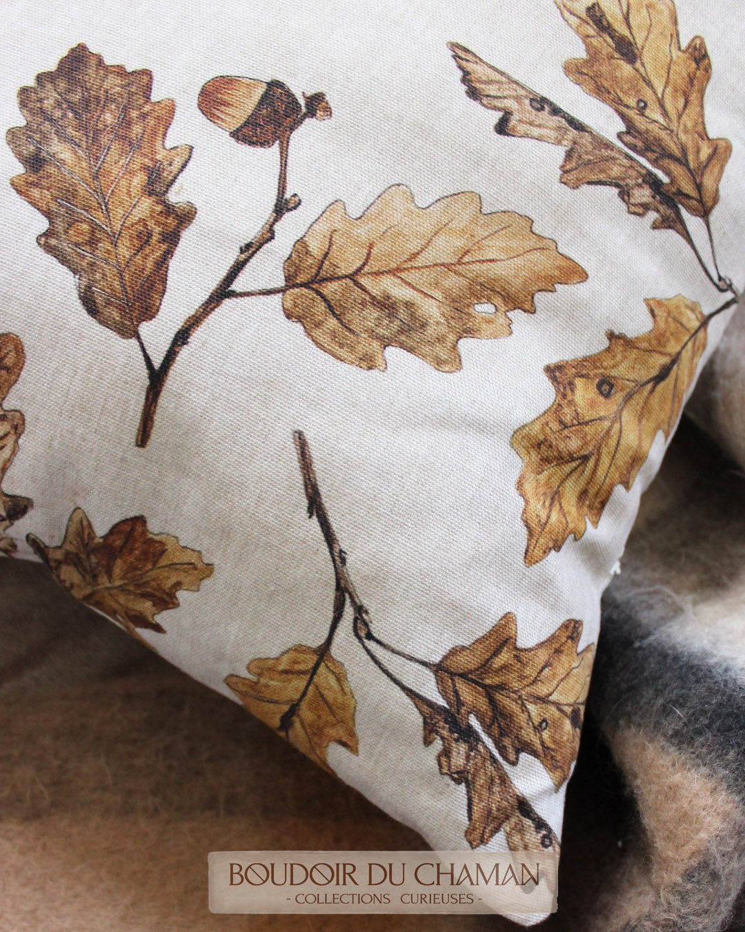 Chaleureux et apaisant, le chêne est un bel arbre sous lequel il fait bon se reposer. Cette housse aux dimensions généreuses vous enveloppera d’un feuillage aux teintes caramel et chocolat. L’imprimé a été réalisé à partir de mes aquarelles automnales. Il est imprimé sur coton bio en France avec des encres écologiques. Le dos est réalisé à partir de tissus chiné. Lavage à la main ou à 30° en cycle court. Ne pas passer au sèche linge.