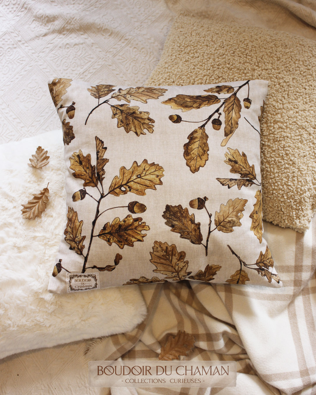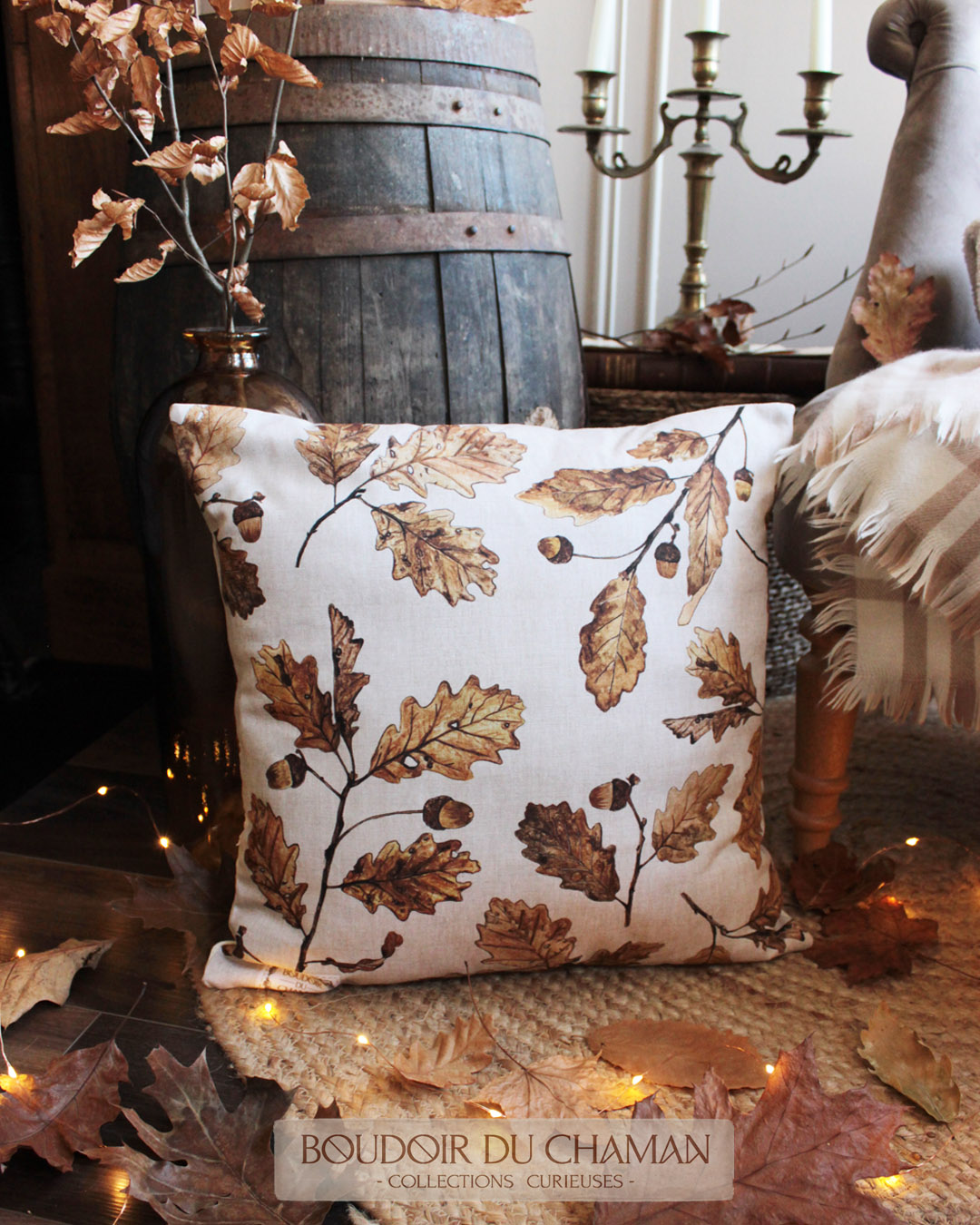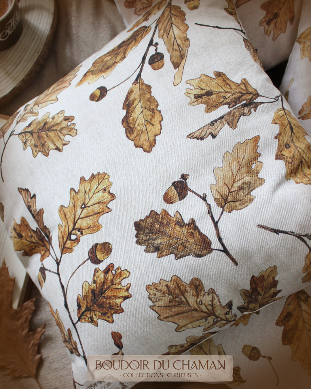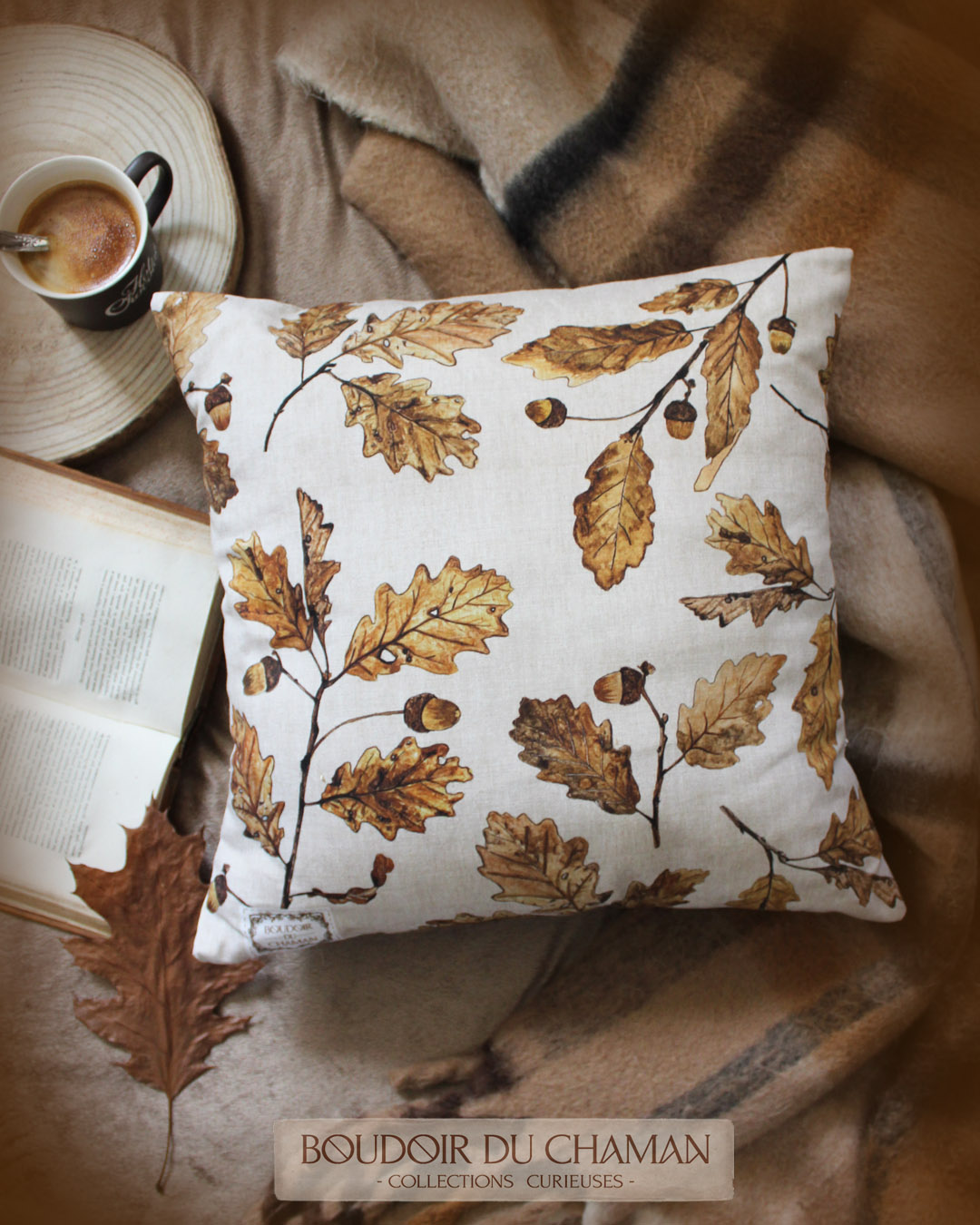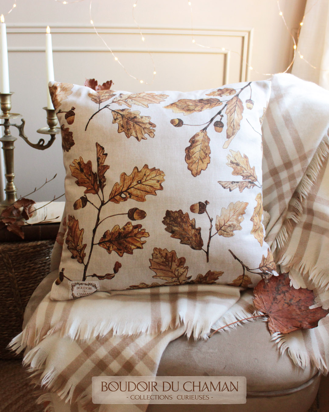 Chaleureux et apaisant, le chêne est un bel arbre sous lequel il fait bon se reposer. Cette housse aux dimensions généreuses vous enveloppera d’un feuillage aux teintes caramel et chocolat. L’imprimé a été réalisé à partir de mes aquarelles automnales. Il est imprimé sur coton bio en France avec des encres écologiques. Le dos est réalisé à partir de tissus chiné. Lavage à la main ou à 30° en cycle court. Ne pas passer au sèche linge.