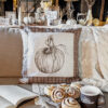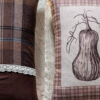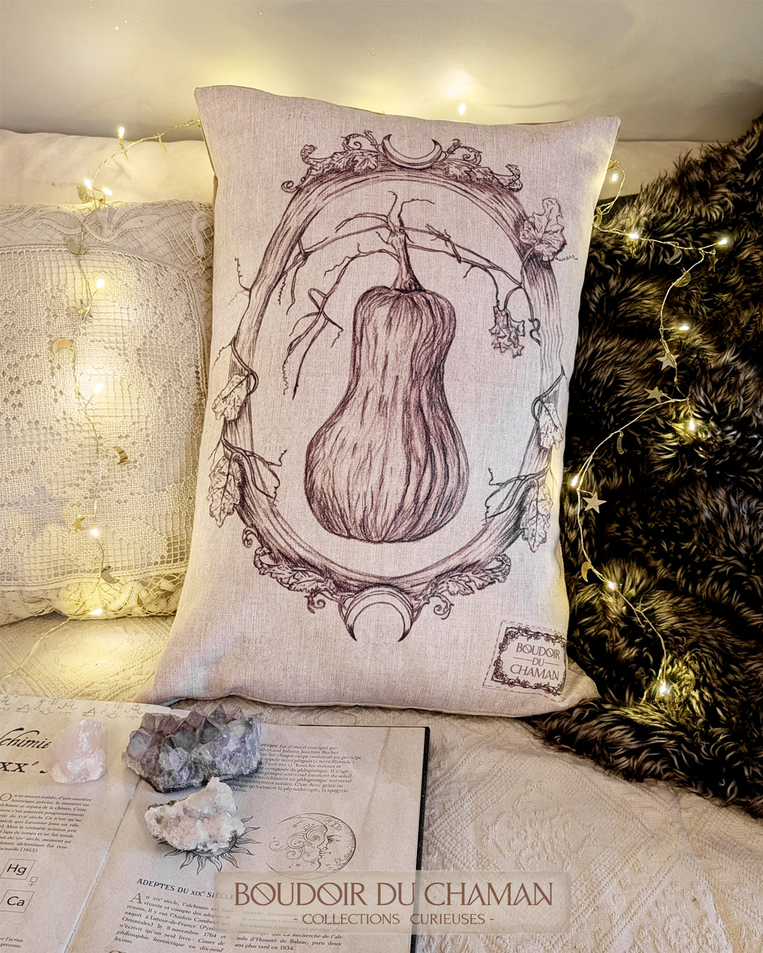Une courge butternut aux feuillages séché hivernal entremêlé dans son cadre baroque aux accents magiques. Cette illustration a été réalisée « à l’ancienne » dans le boudoir, au crayon aquarelle et à partir d’une courge de mon jardin. Le dos est brodé de dentelle. Lavage à la main ou à 30° en cycle court. Ne pas passer au sèche linge.