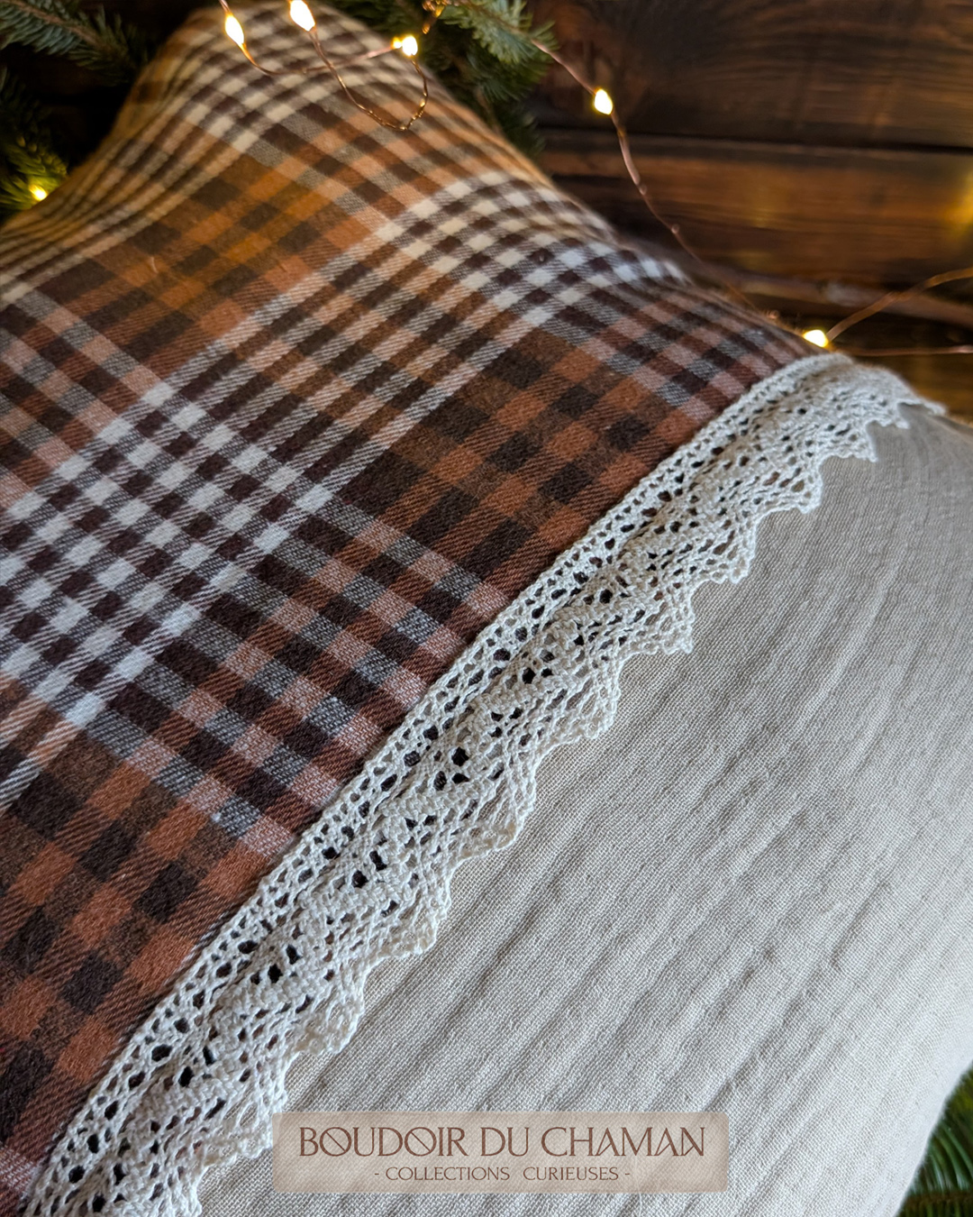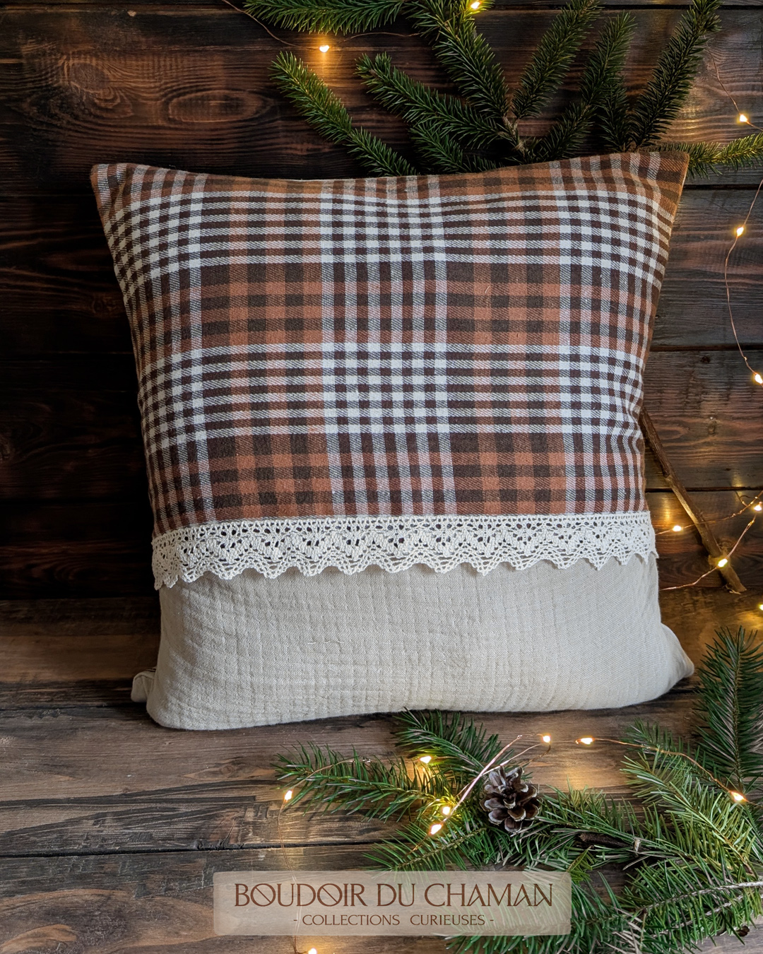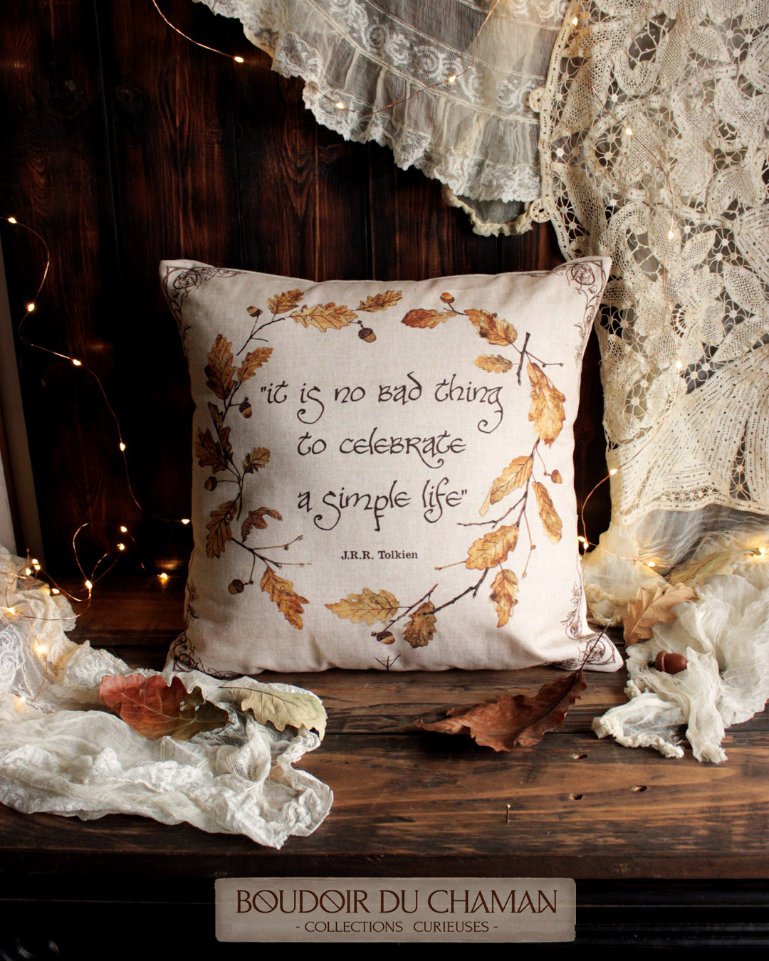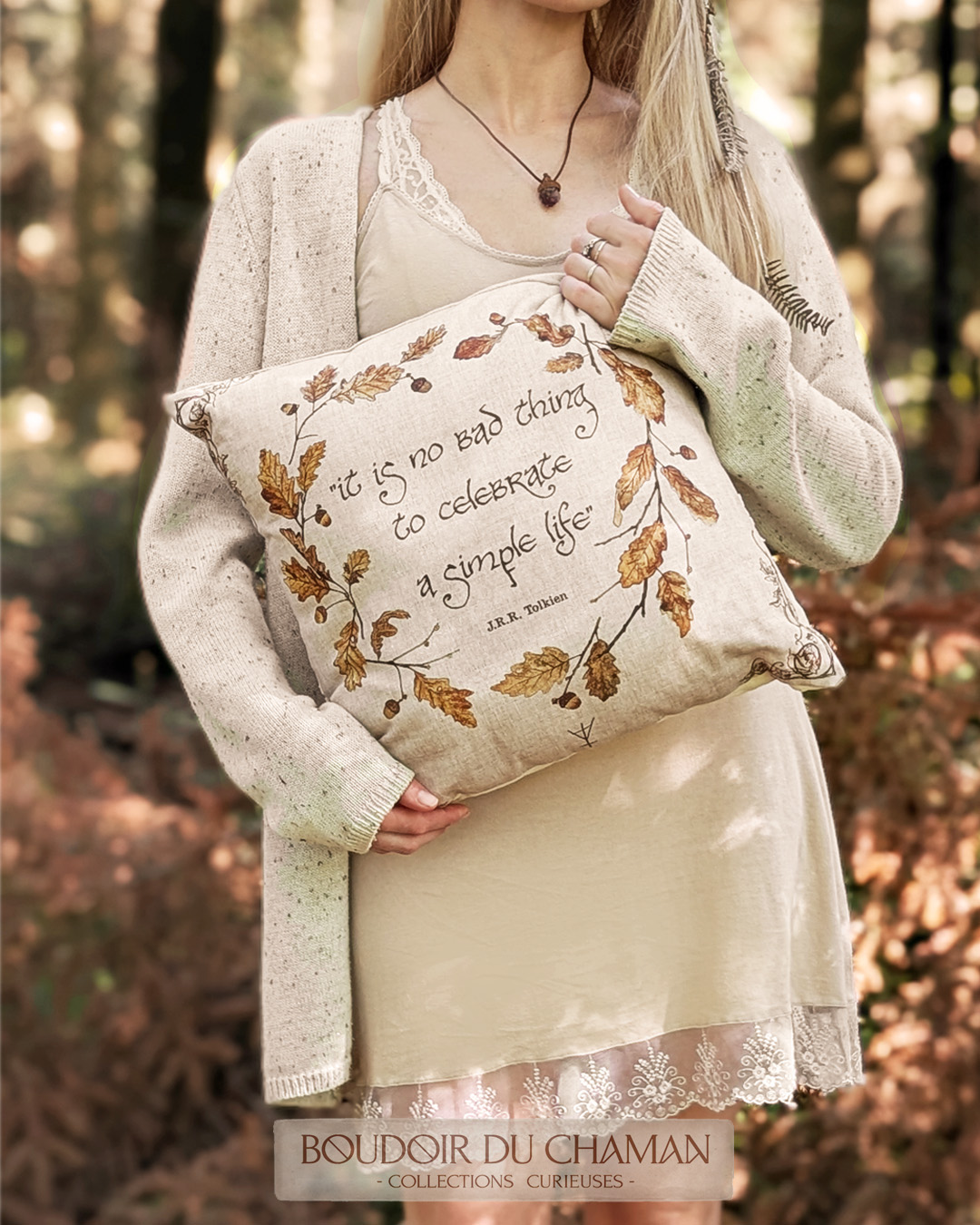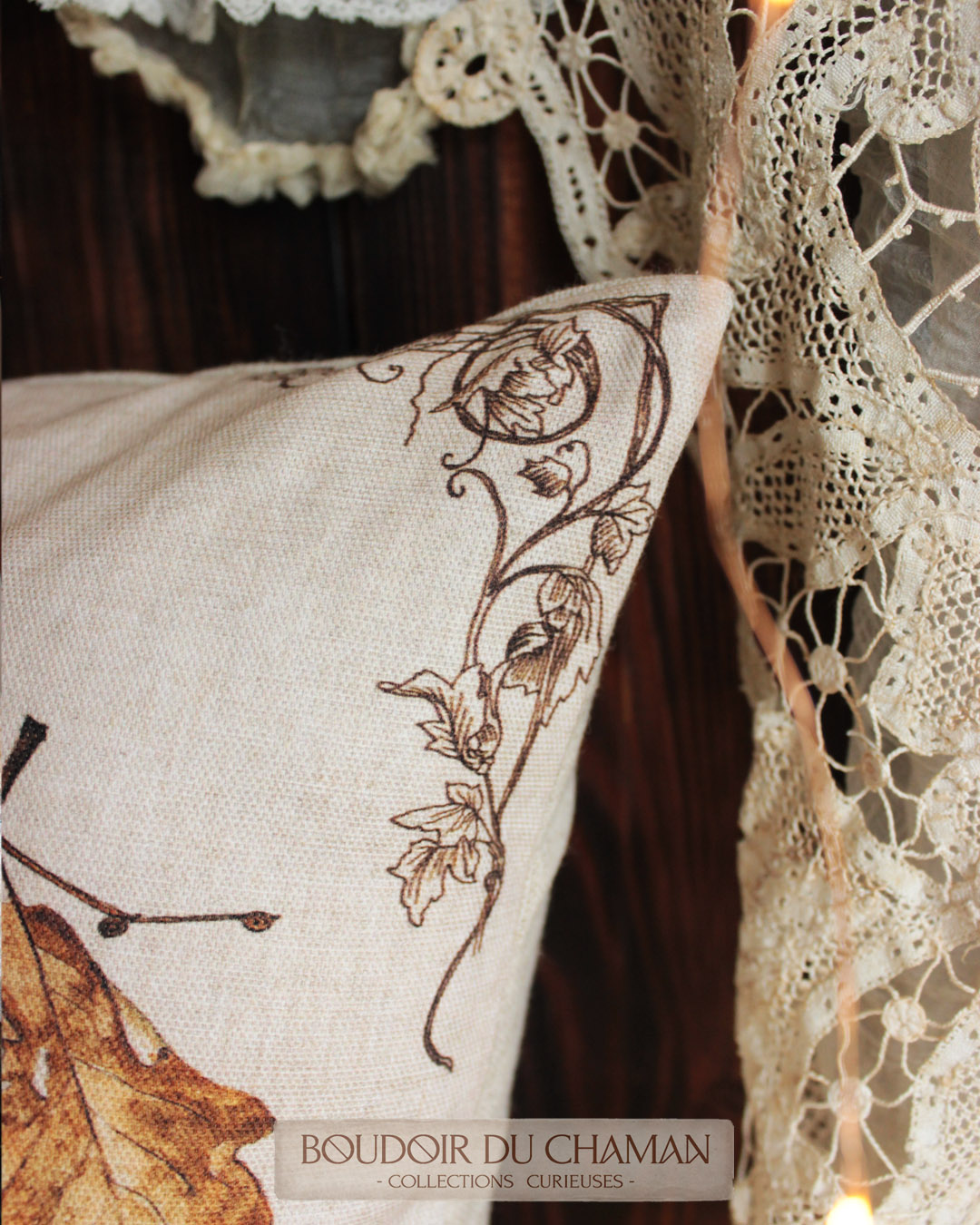 Une ode à la fois aux petits bonheurs et aux merveilles de l’Automne! Cette ronde de chêne a été réalisée à l’aquarelle par mes soins. Les nuances chaleureuses de ce tourbillons forestiers vous accompagneront dans vos journées et soirées cocooning! Imprimé en France avec des encres textiles écologiques sur du coton bio. dos en tissus et dentelle chinés.