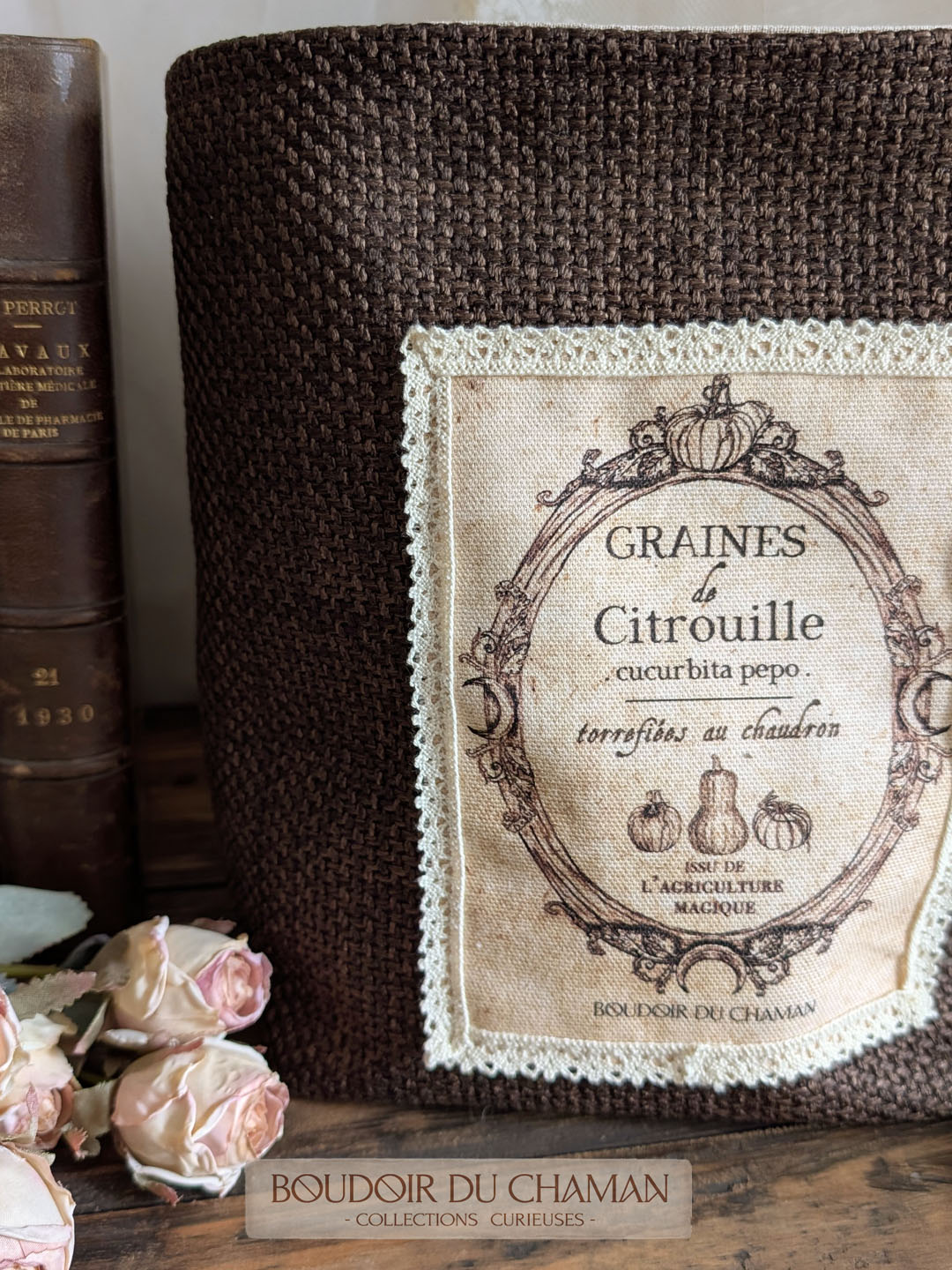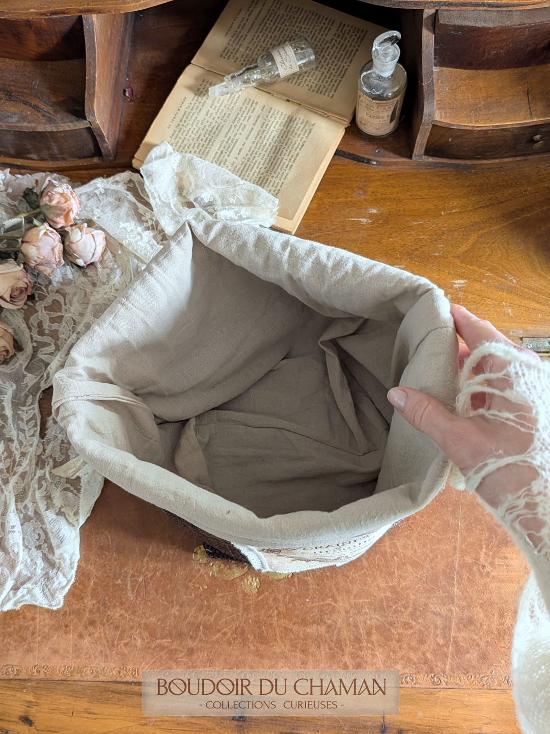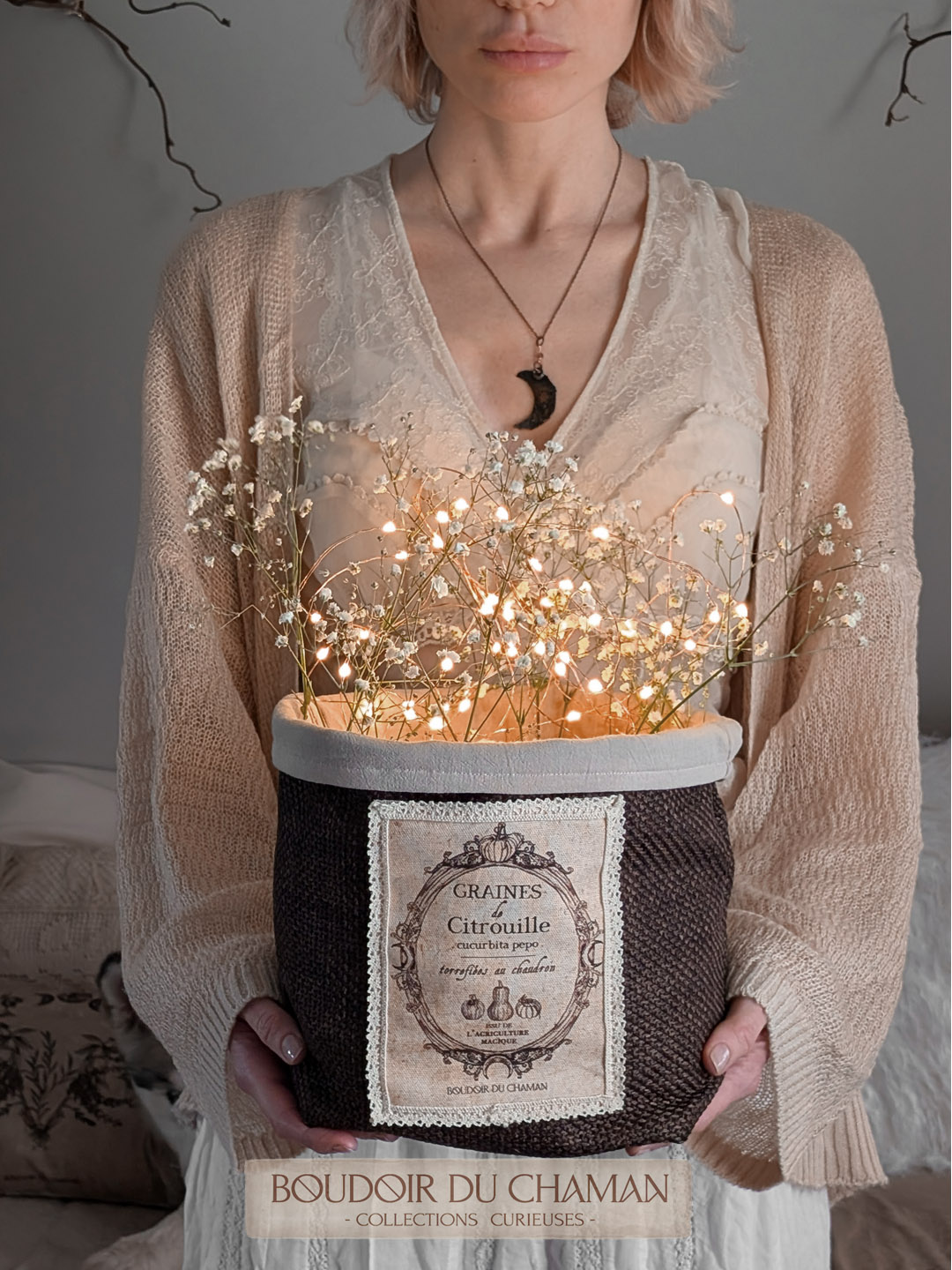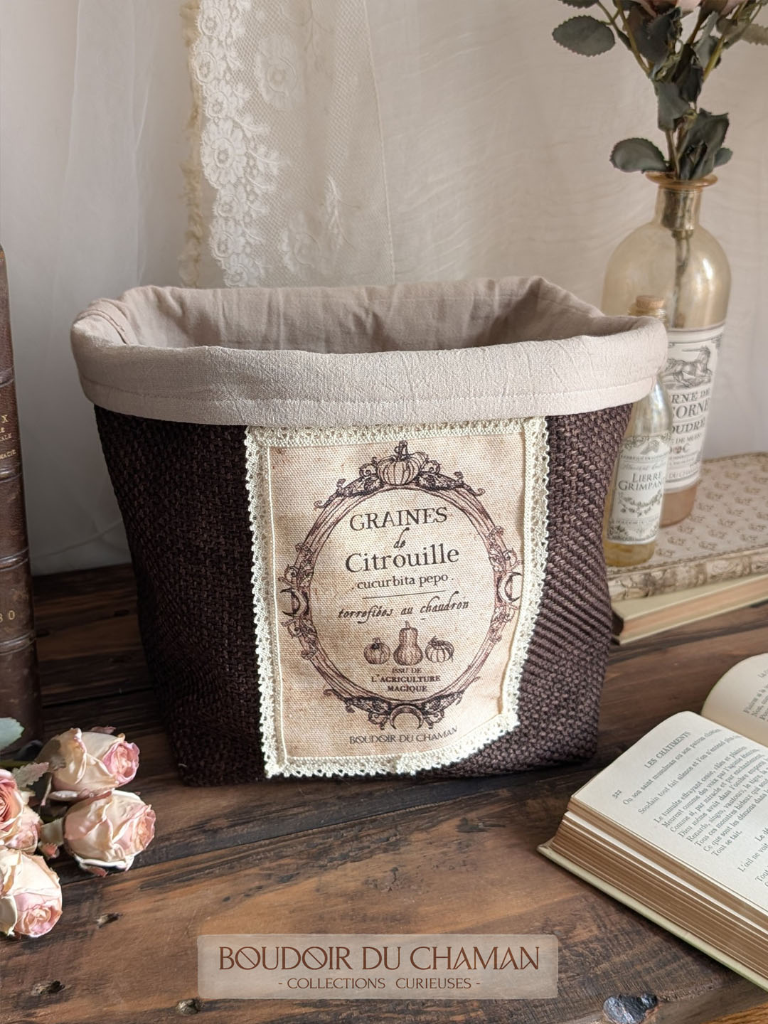 Pour organiser votre foyer avec une touche de magie… ce panier a été entièrement confectionné avec amour dans le Boudoir. Il peut contenir vos objets magiques, vos produits de beauté, vos tisanes et accessoires de cuisine, votre matériel de bureau ou même servir de cache-pot à votre mandragore!