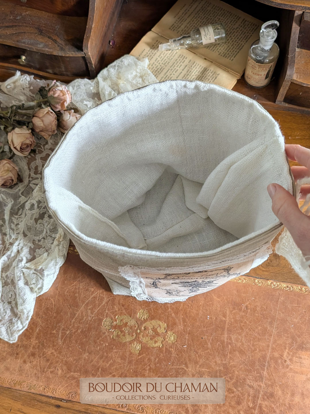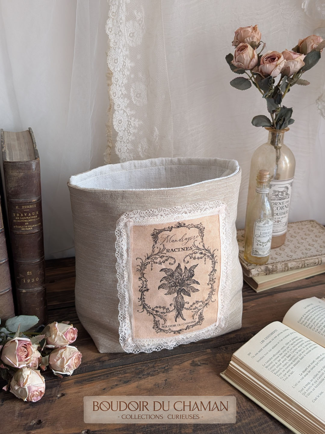Pour organiser votre foyer avec une touche de magie… ce petit panier a été entièrement confectionné avec amour dans le Boudoir. Il peut contenir vos objets magiques, vos produits de beauté, vos tisanes et accessoires de cuisine, votre matériel de bureau ou même servir de cache-pot à votre mandragore!
