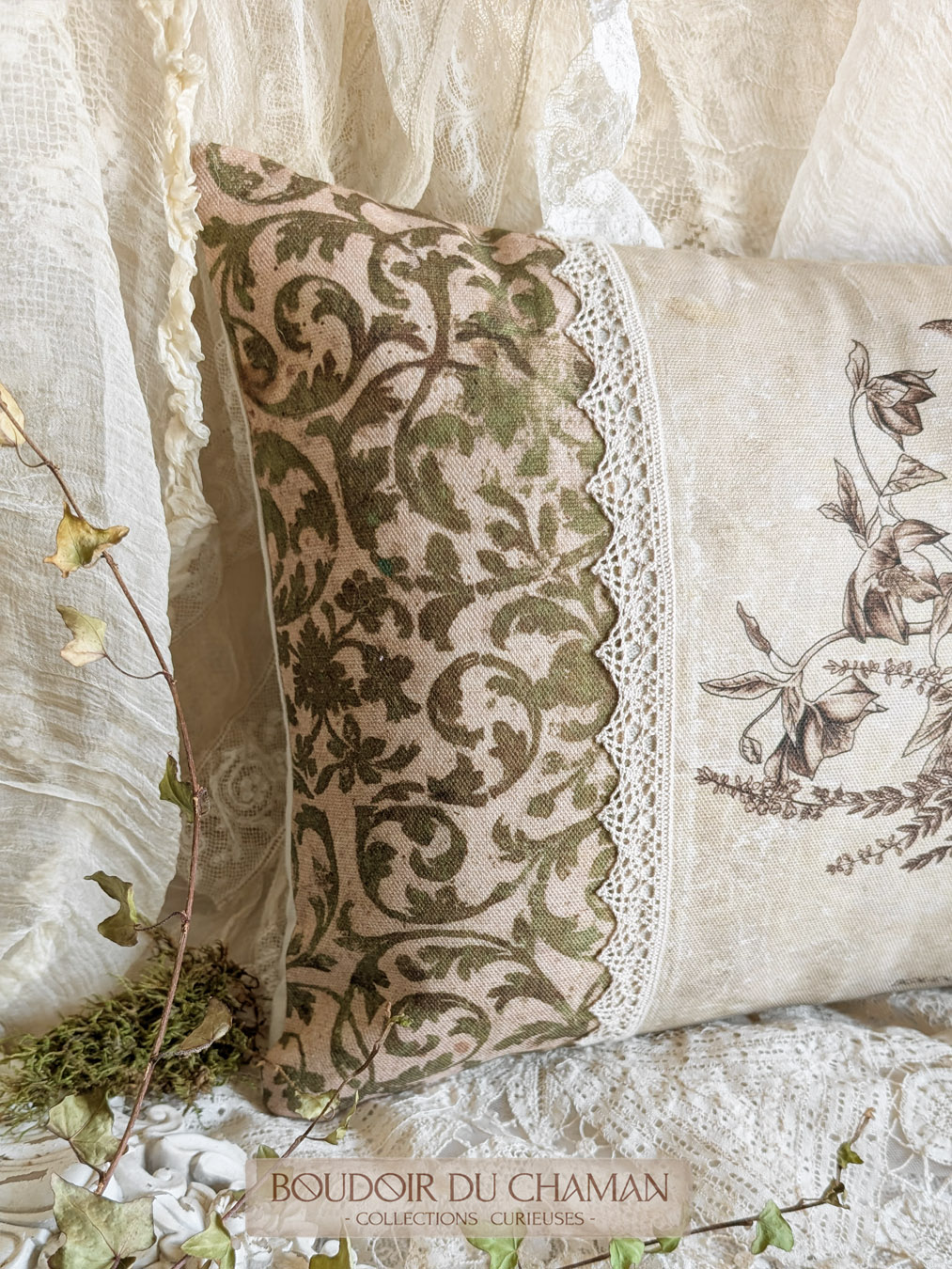 Imprimé en France avec des encres écologiques sur du coton bio. Les dos des coussins sont fabriqués avec des tissus vintage et sont brodés de dentelle. Lavage à la main ou à 30° en cycle court. Ne pas passer au sèche linge.