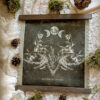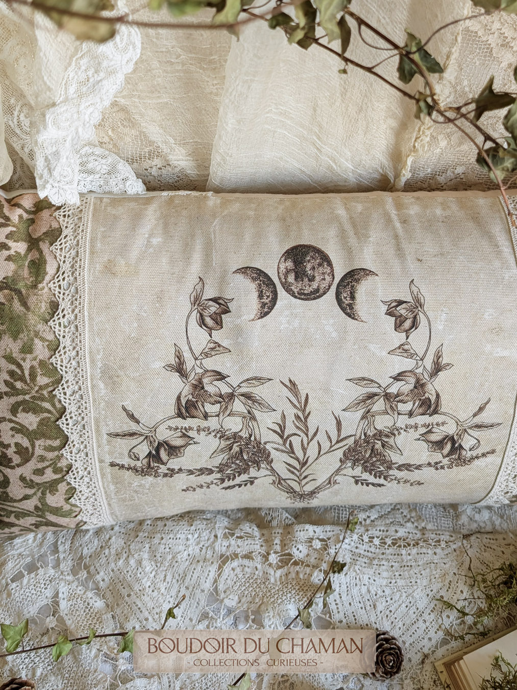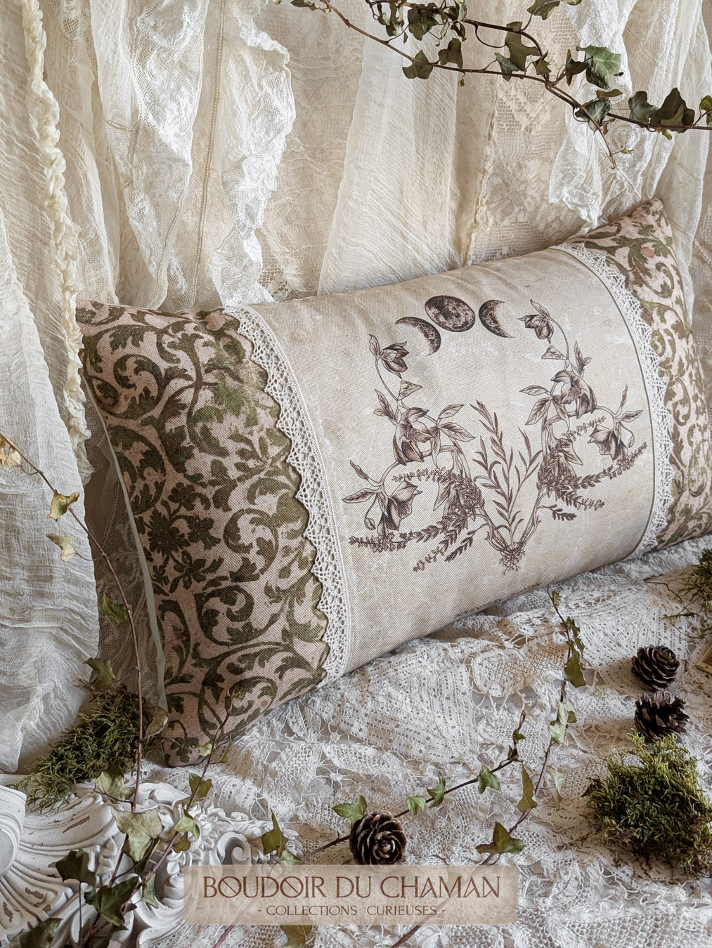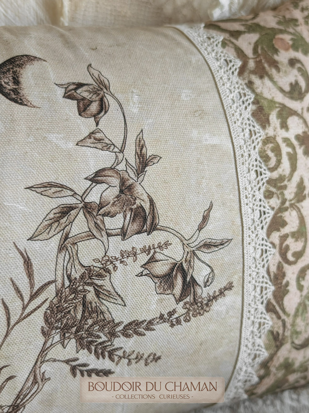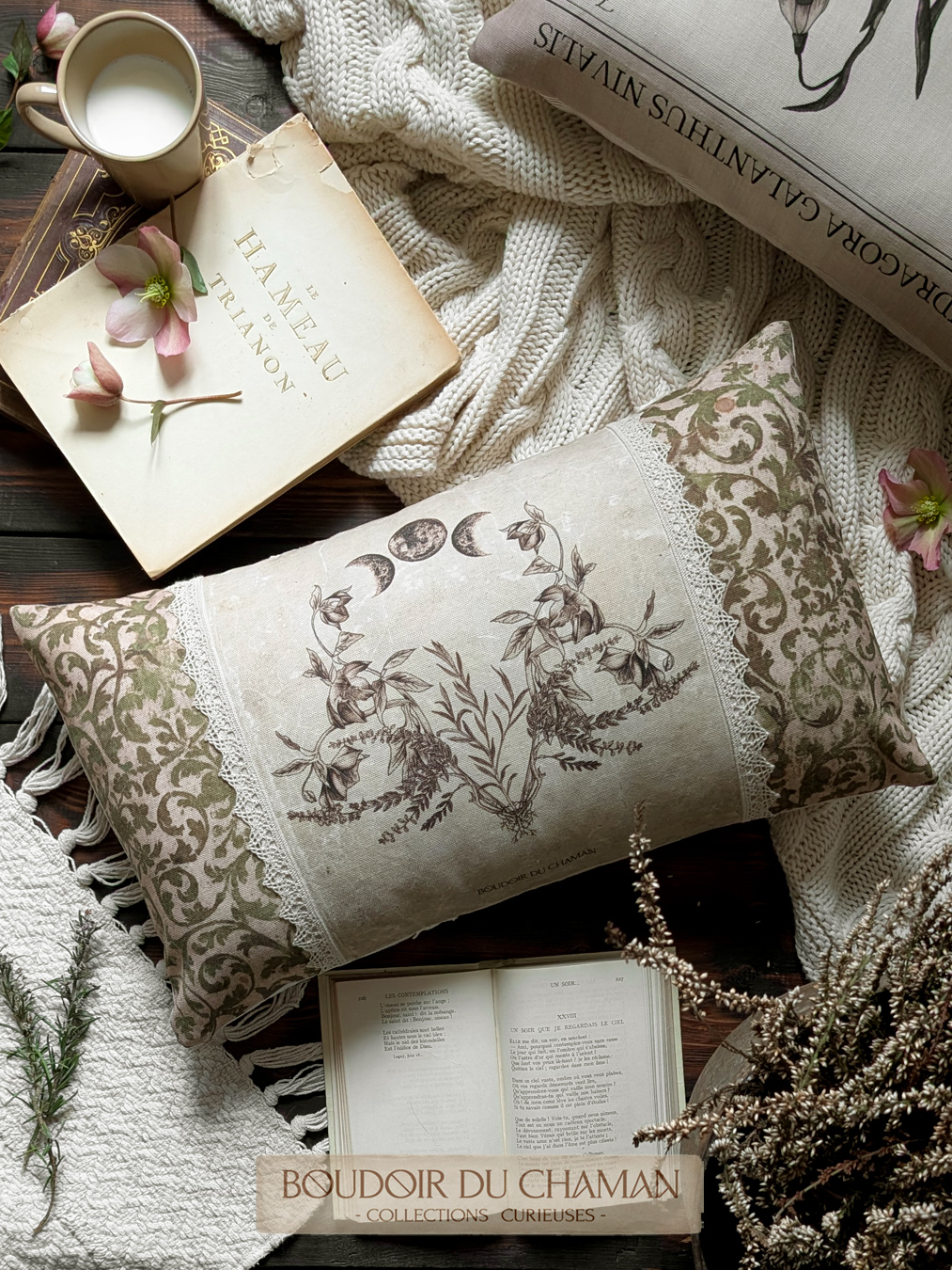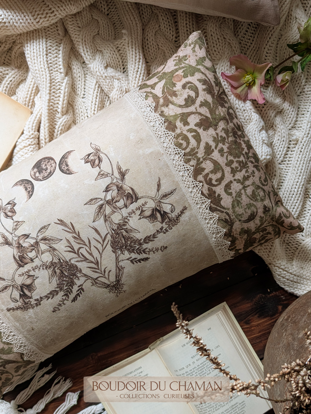 Pour une décoration mystique et des songes magiques… ce coussin est imprimé d’un de mes dessins réalisé pour la fête celtique d’Imbolc. Elle met en scène des hellébores, de la bruyère et du romarin. Trois plantes magiques pour bénir, porter chance et purifier.
